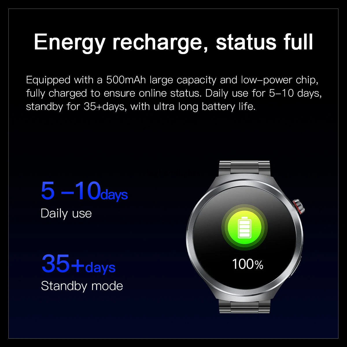 🔋Long Lasting Battery Life 10 days Daily Use and 35 Days Standby Time depending on usage.