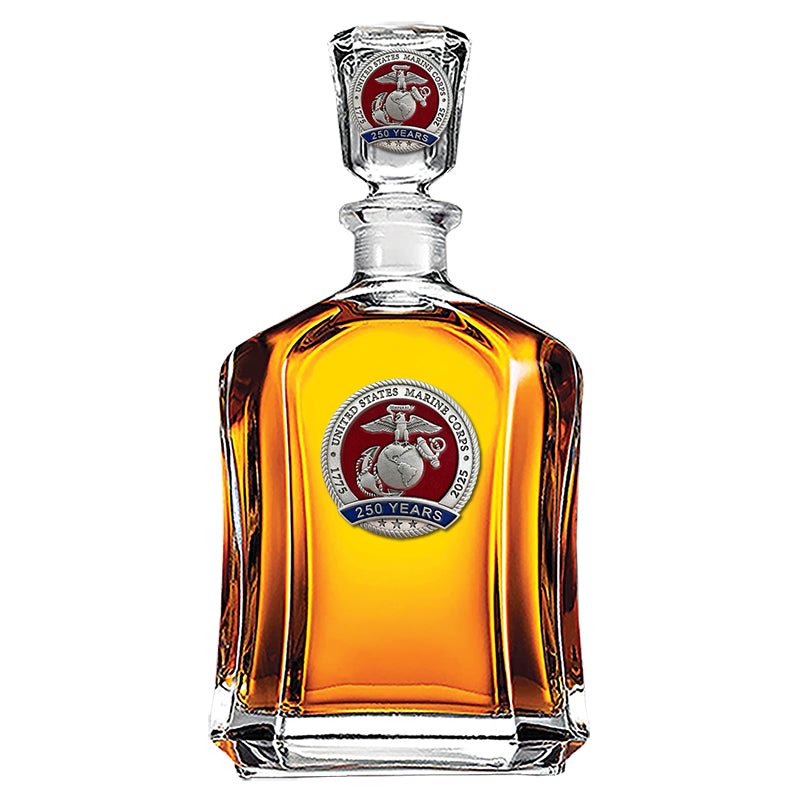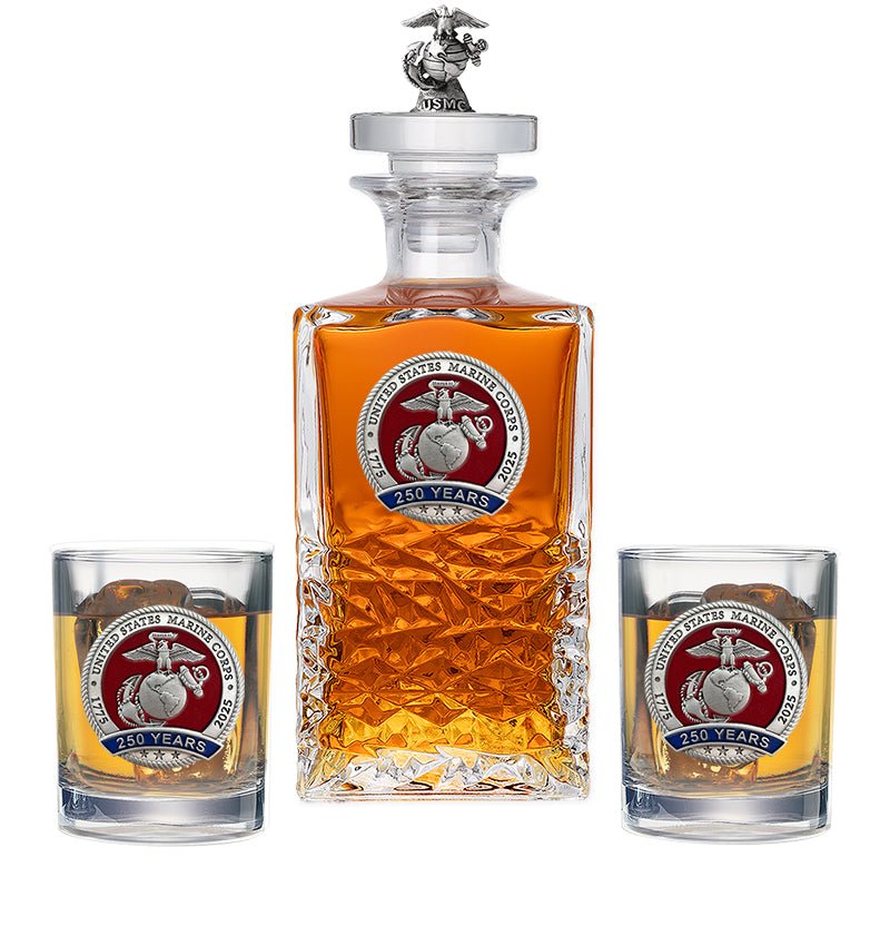 250th Anniversary Marine Corps Heritage Whiskey Bottle with 3D Top & 2 Glasses