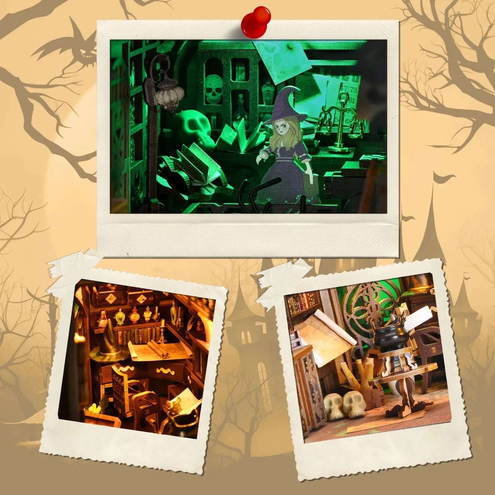 Feel the eerie chill as the dark room comes alive with haunted green and ghostly yellow lights, casting shadows across the mysterious lair. From spell scrolls to bubbling cauldrons, every detail beckons you to explore the strange, magical happenings within. Perfect for decorating your Halloween shelf or embarking on a creative adventure, this kit opens the door to a world of spooky imagination.
