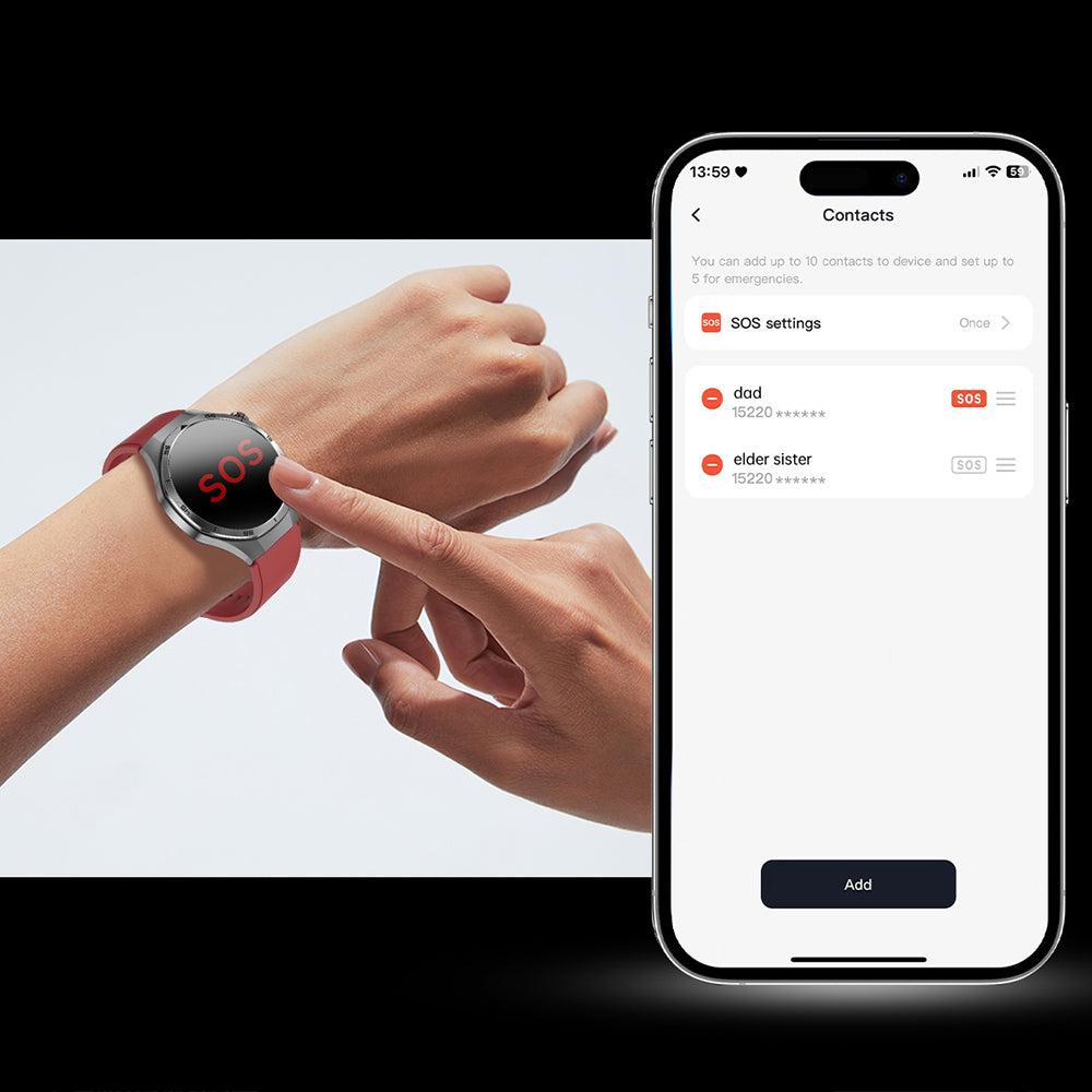 Emergency Contact Feature Allows you to quickly call your designated emergency contact by pressing and holding the side button when assistance is needed.